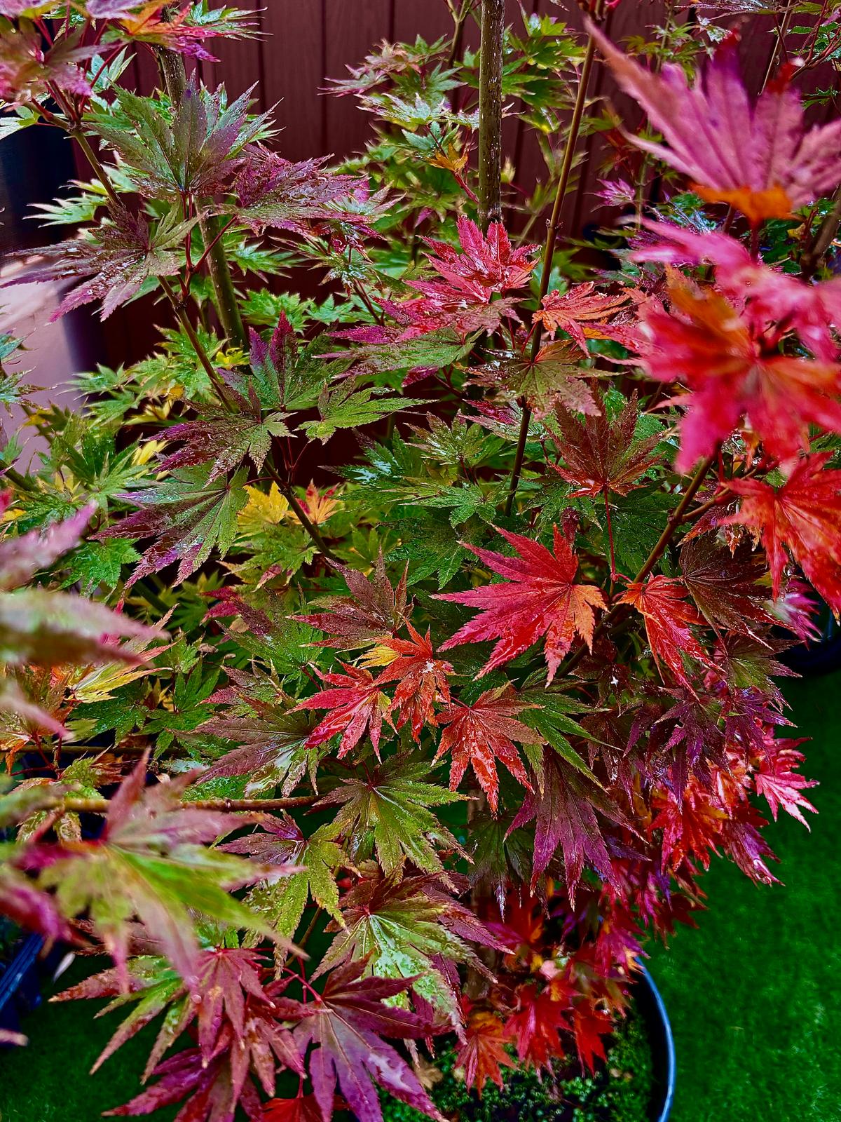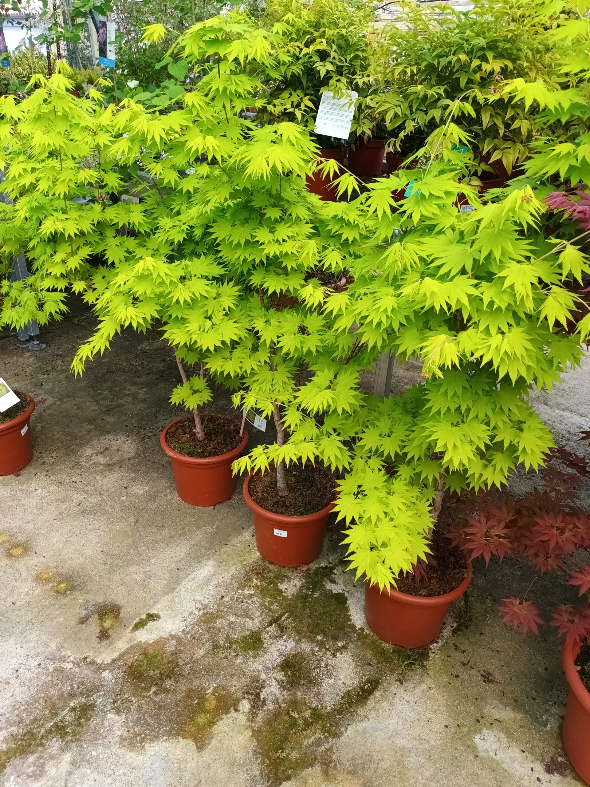 Arce japonés con hojas de color amarillo brillante durante toda la temporada, virando a naranja en otoño. Muy decorativo. Porte pequeño, entre 2 y 3 metros.