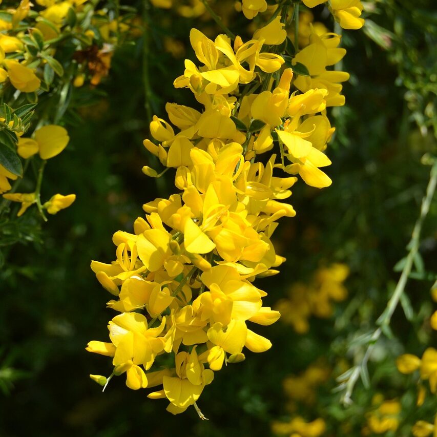 Arbusto mediterráneo con ramas verdes, hojas reducidas y flores amarillas. Crece hasta 1.5-2 metros.